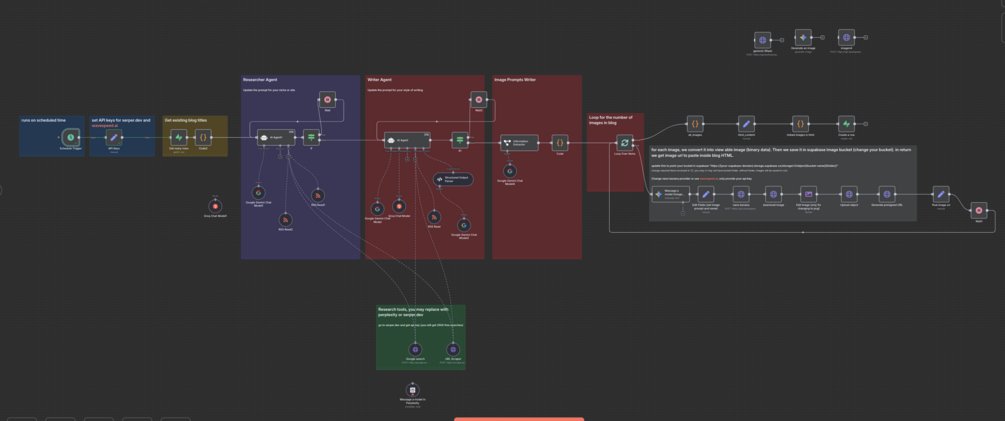 This workflow automates the entire blog creation pipeline—from topic research to final publication. Three specialized AI agents collaborate to produce publication-ready blog posts with custom images, all saved directly to your Supabase database.