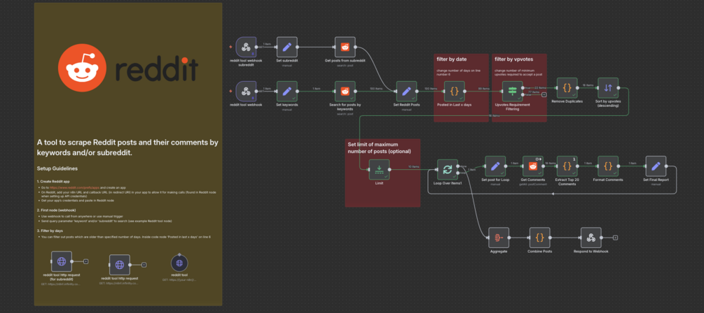 A powerful workflow to scrape Reddit posts and comments by keywords and/or subreddit, with intelligent filtering and formatting.
